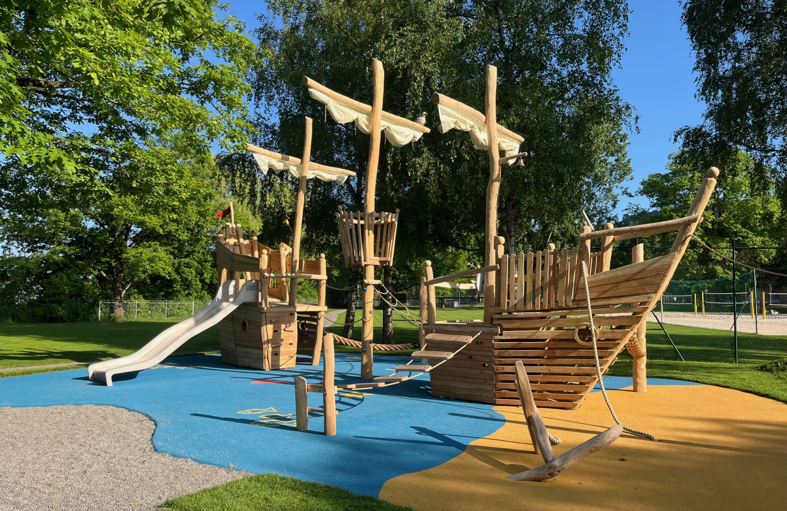 Sand, Wiese, Wasser und Berge